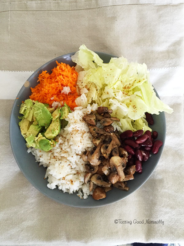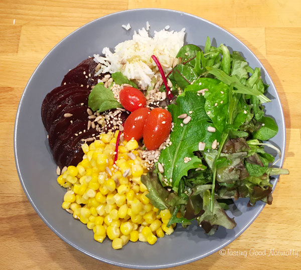 Assiette composée riz, maïs, crudités, betterave #vegan
