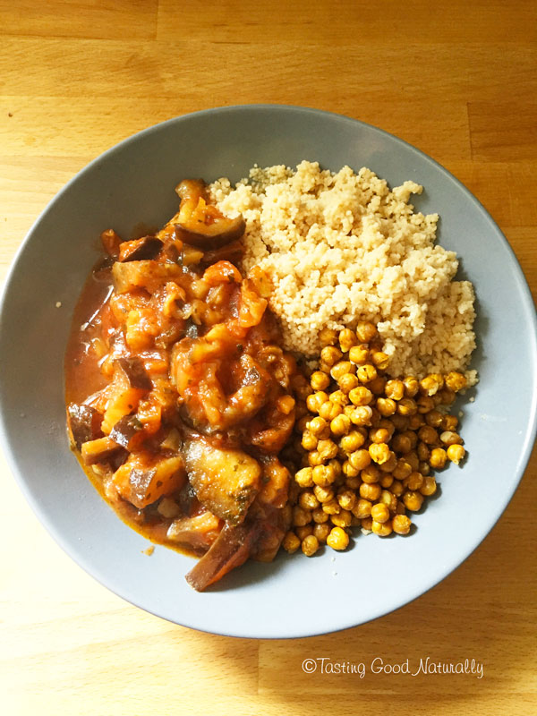 Aubergine à la tomate, semoule et pois chiches