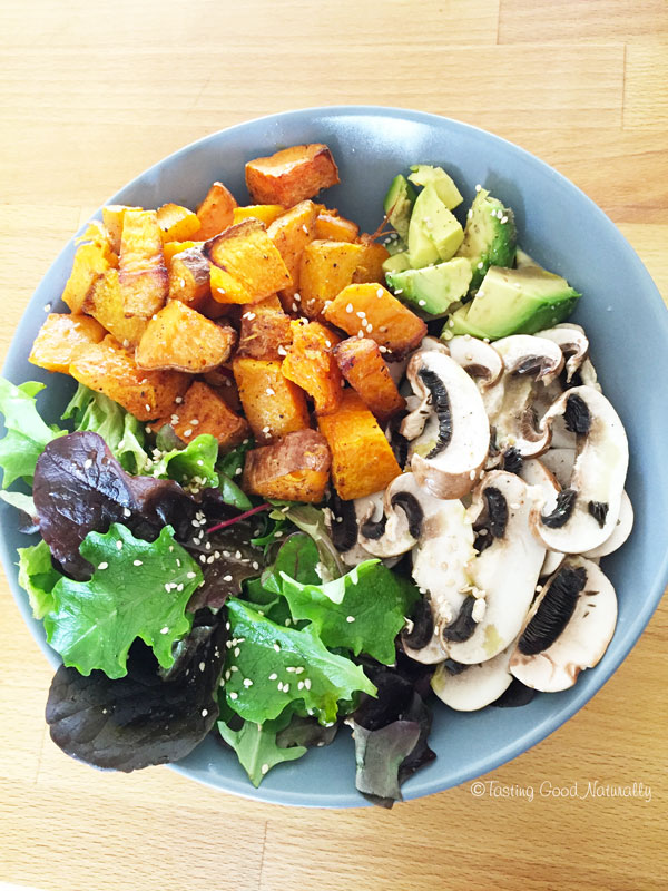 Courge et patate douce rôties et ses crudités