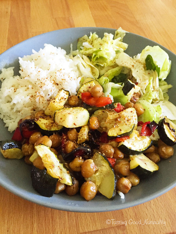 Légumes d’été et pois chiches rôtis, riz et crudités