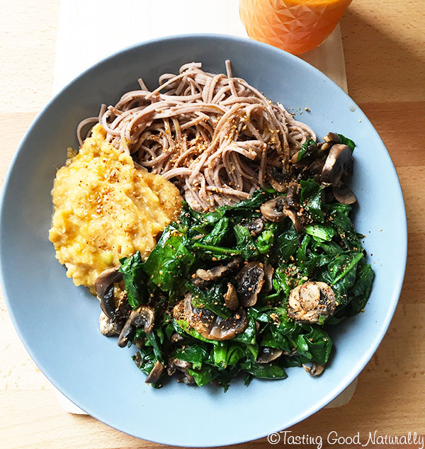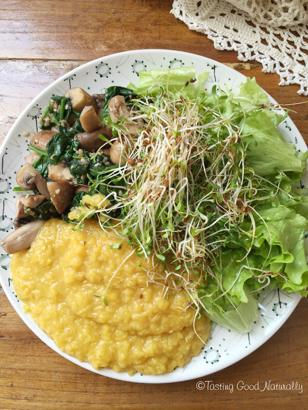 Poêlée de champignons épinards, lentilles corail et crudités