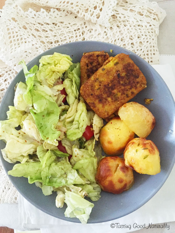 Pommes de terre rôties, burger au lupin et crudités
