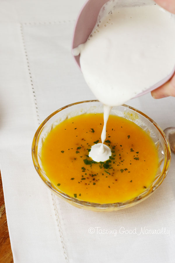 Soupe aux carottes, gingembre et citron et sa crème aux noix de cajou